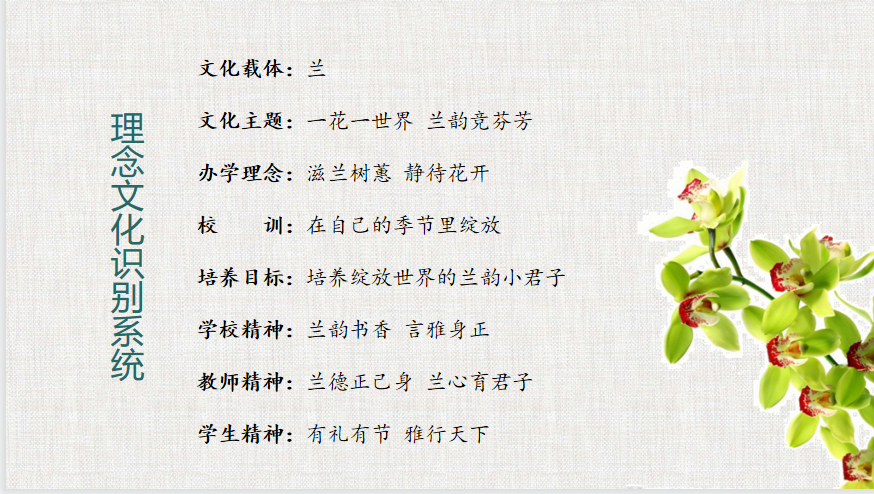 “兰韵课堂、兰韵教师、兰韵君子、兰韵家长”,一所与兰花一样盛开的学校,一所承载着数千年“兰”文化的学校,一所践行了“兰”韵教育的学校,它的校歌应与学校的教育一样——《兰韵芬芳》。