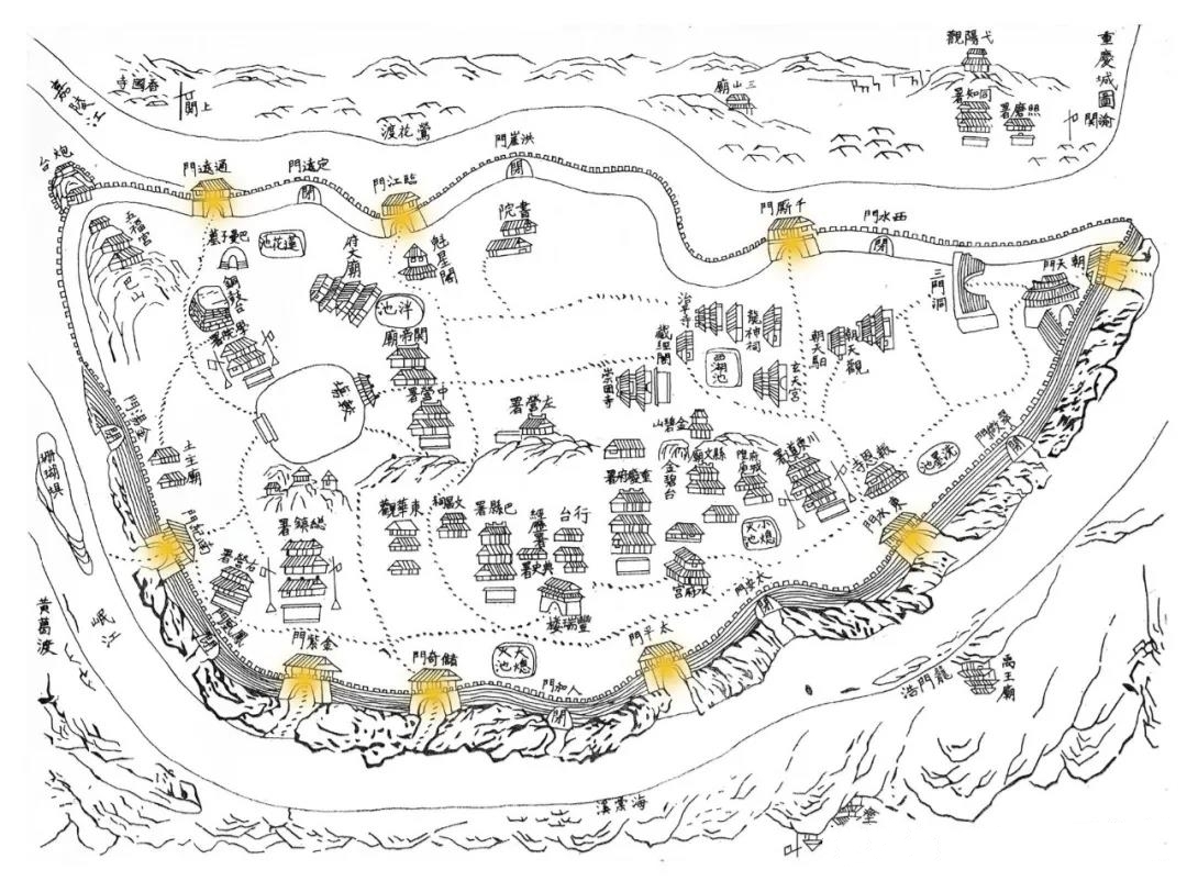 清光绪《重庆府治全图》中绘出了这十七门,按顺时针方向依次为:金紫门、凤凰门、南纪门、金汤门、通远门、定远门、临江门、洪崖门、千斯门、西水门、朝天门、翠微门、东水门、太安门、太平门、仁和门、储奇门。